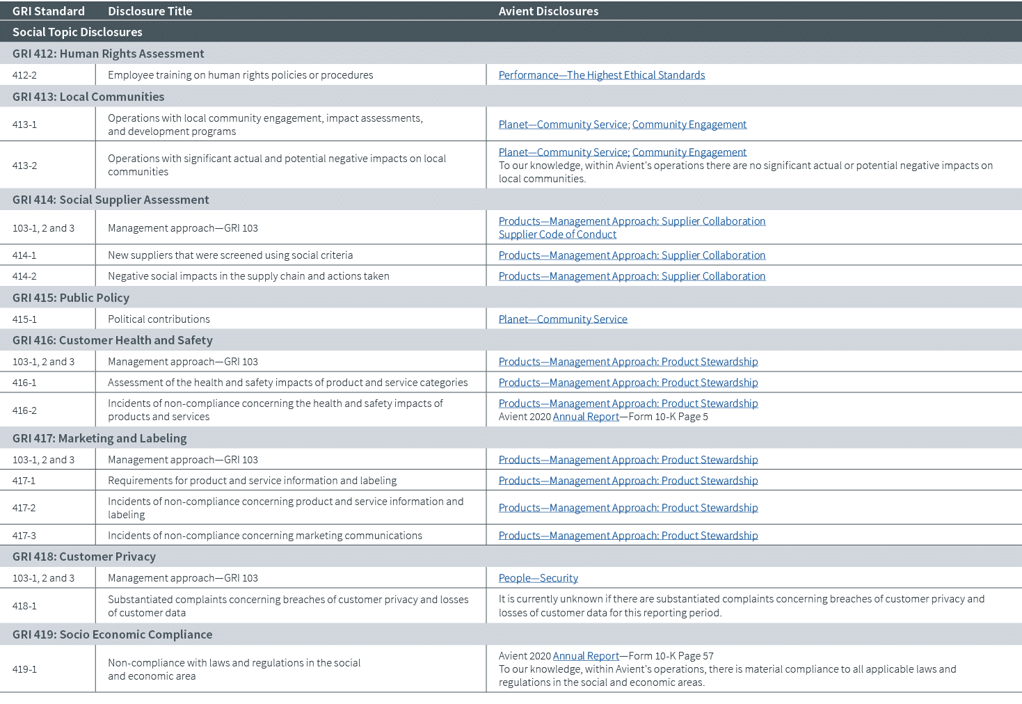 Avient’s EH&S MS is comprised of global standards for safety, health, security, product safety, and environmental protection, covering the transportation of materials, activities at our sites and warehouses, and distribution of our products, as well as our customers’ use of our products. It covers both regulatory requirements and voluntary actions. The policies and codes that are included in the EH&S MS are:
